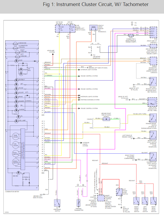 It looks like you might have a fuse out because it takes two to run the cluster and tach. Here is a cluster wiring diagram and a guide to help you check for power and ground and also a signal from the cruise control which is where the tach gets its signal from.