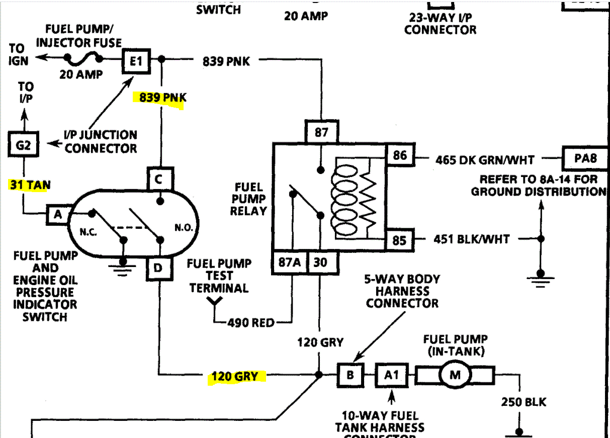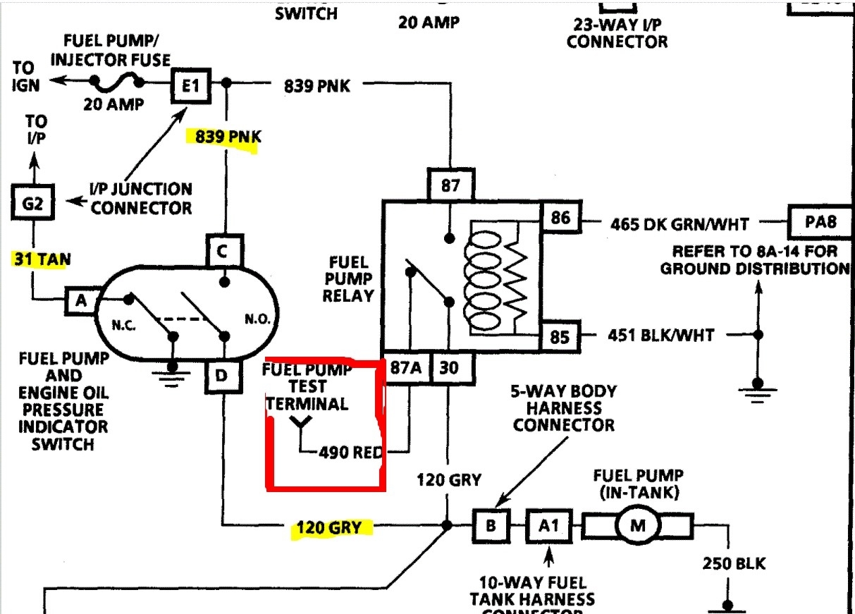 2. Pin No. 87 A (or B with me): Right now, it is connected to a (gray) wire coming all the way from that 3-wire connector of the Oil Pressure Switch/Fuel Pump Switch ( The Oil Pressure Switch fails to give any oil pressure reading on the gauge within the Instrument Panel, I replaced it twice but the problem is still the same). Again for the GREY wire, the lamp tester lights when the engine runs and it gets positive signal accordingly so the (Fuel Pump Relay) works alright. Needless to say, according to your schematic diagram, it should be connected to the (red) wire, but this wire has no electricity at all( seen in the 3rd attachment here. I am awaiting a clarification from your side to locate those two Fusible Links( shown in the 4th attachment) which may be the reason it went dead (hopefully) since they are part of the (red) wires and might have been disconnecting the circuit.