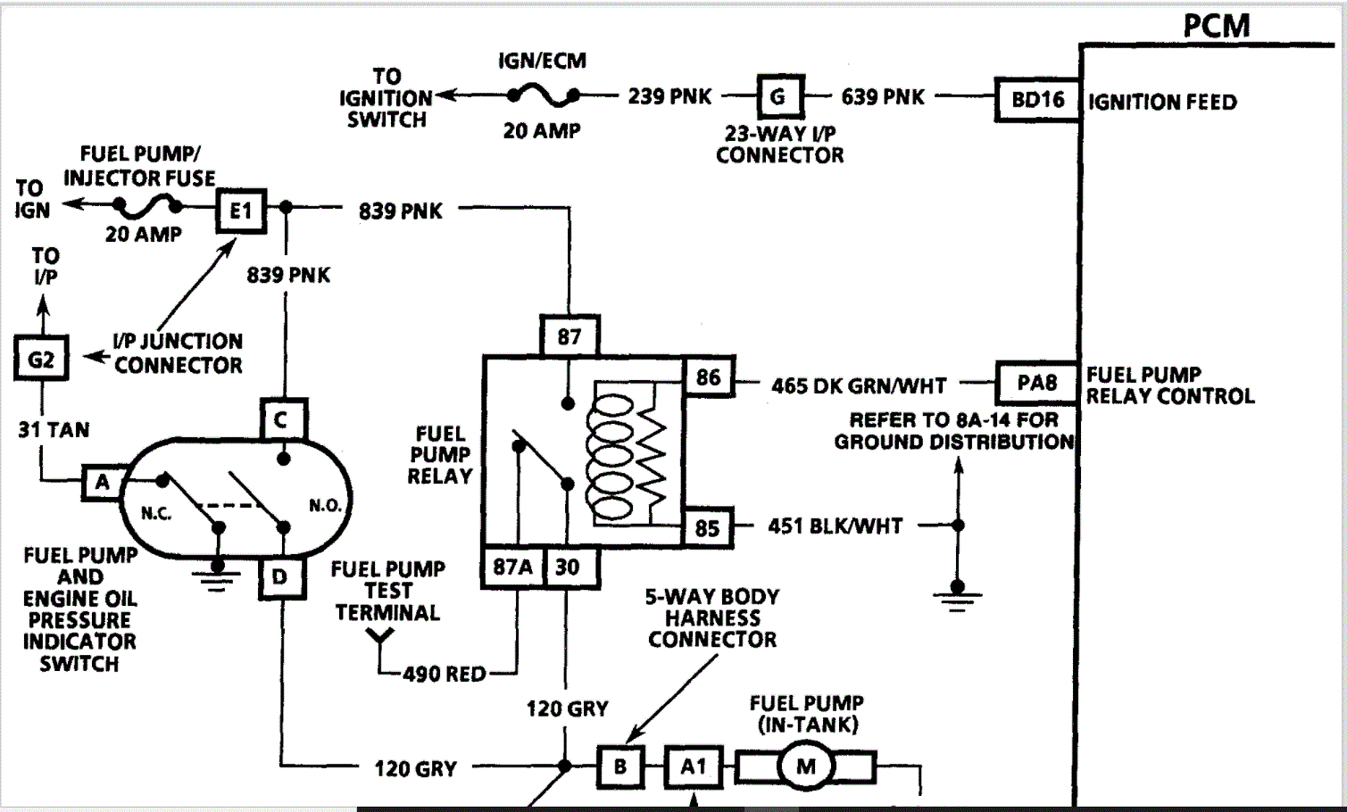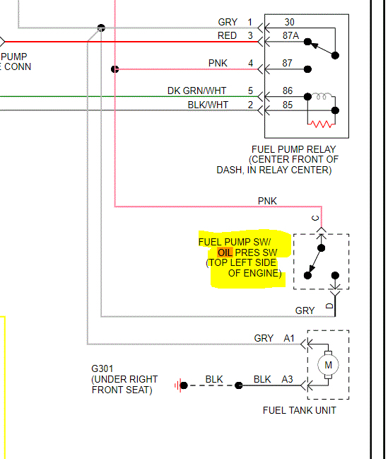 You started with a diagram for that grey wire connections (attached here) . The schematic diagram turned out to be for a (2-wire Oil Pressure Sensor/Connector) so you kindly started sending me 100% relevant schematics as to my very case of a 3-wires connector and sensor. The first schematic you sent (despite being for a 2-wire connector) had a beautiful tracking of the grey wire but it would then disappear at the top of the diagram, I needed to know where would that line for the grey wire be going since I have a grey wire coming from behind the engine to reach the Fuel Pump Relay but it is a dead wire with no voltage (this is the reason my electrician bypassed the ECM and fed the Fuel Pump Relay line via the ABS relay since it is a switch-live point- Sometimes we went as far as feeding the Fuel Pump relay via the hot end of the car battery to escape sudden stalling) . thought to be the same grey wire so I need to track it ( from the Oil Pressure Sensor connector all the way till it reaches the Fuel Pump Relay and the ECM, I need to check where the hell does it get dead. Can you provide that, with due gratitude and thanks for your invaluable information?