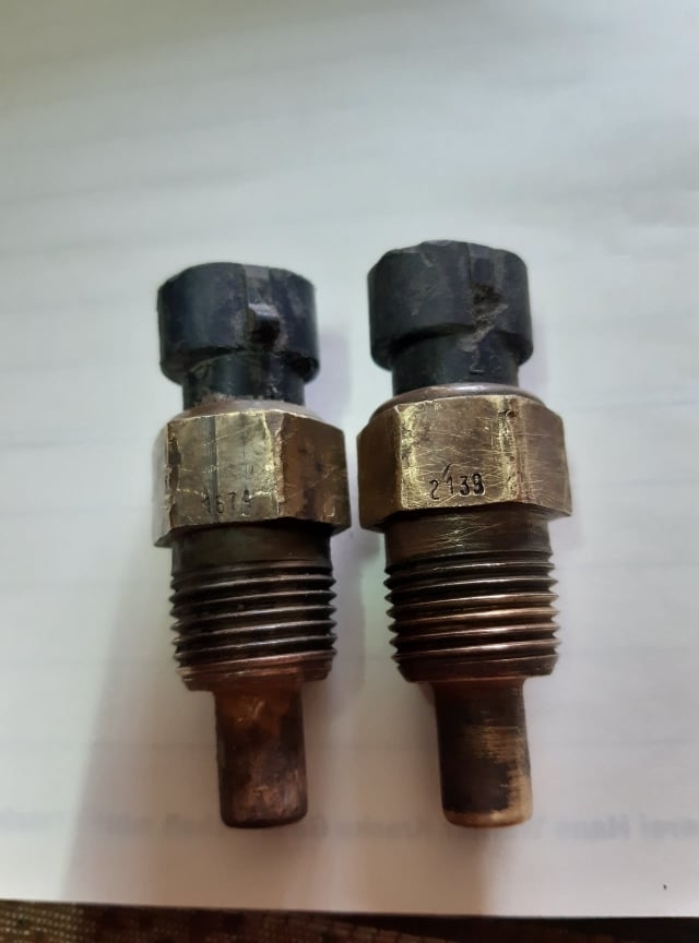 Awaiting your next reply I checked the Coolant Temperature Sending Unit ( to ECM), it has only one wire attached to its connector, another orphan wire is dangling right behind the engine and since I had replaced the Oxygen Sensor and attached it to the other dangling wire right there so the one left has been taken by me as relevant to the Coolant Temperature Sender Unit especially that it has 2-pins and its connector also has 2 pins. Am I right with that? I am trying my best to help myself amending all other faulty locations that might be relevant to the engine stalling, it has been a non-stop act so far. The attached images are(in sequence): My old Coolant Temperature Sender unit and the old connector with 1 wire only- The old and the replacement Coolant Temperature Sensor Units, they look the same both having a stamping of ( AC - 12 V) but the numbers facing the camera differ - The old Sender Unit connector ( with one wire only, the other wire has been cut off by an earlier mechanic work, only a few millimeters left of it- i soldered it to a piece of wire so the connector now has 2 wires to match the 2-pins Sender Unit).