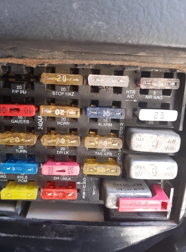 The three fuses I circled at the bottom are for the following (from left to right). Airbag, PCM, Cruise control.