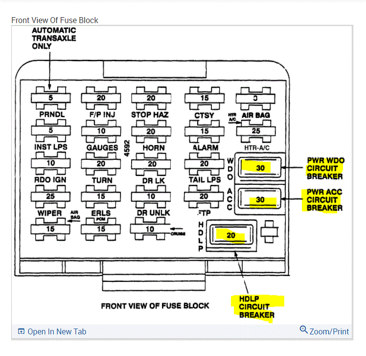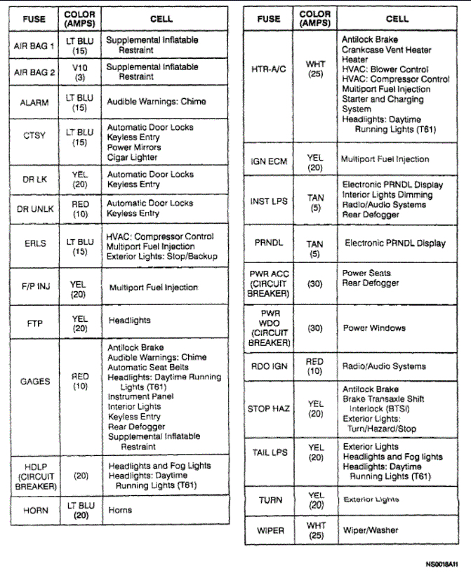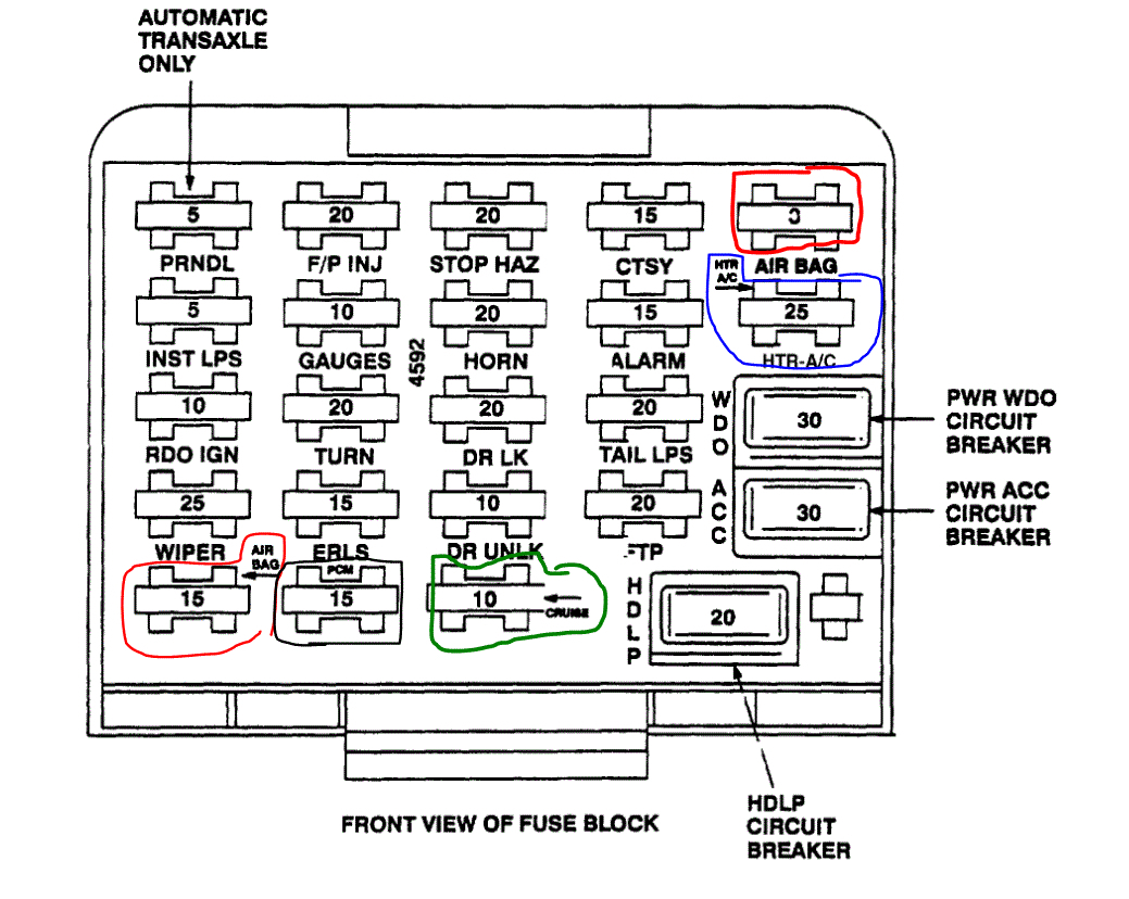 The two fuses with the red circles are both related to the airbag. The black circle is for the PCM. The green is for cruise control. The blue is for the HVAC.