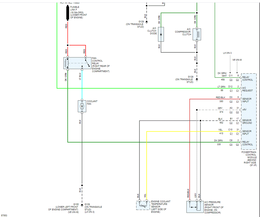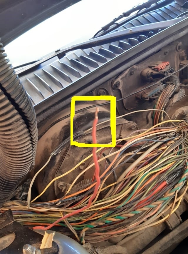 As you can see in the attached image( First one), I stripped the thick harness sleeve lying behind the rear side of the engine to check for any suspicious wire. The red wire (highlighted in yellow) has no voltage in all positions of the Ignition Switch, just a dead wire. Is it the same red wire shown in the schematic I received earlier from you ( Second attachment), the one having a fusible link : either (Fusible Link F 16 GA-ORG Lower Front of Engine) or ( Fusible Ling A 16 Ga-ORG Lower Front of Engine) as described in the attached schematic diagram ( both surrounded by a red rectangular frame? If it is the same wire as I believe, kindly acknowledge: where can I find these fusible links exactly? how does it look on the front side of the engine?