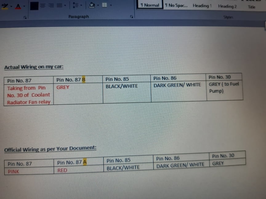 I also checked my Fuel Pump Relay as per the pins numbers and the colors of the wires attached to each pin. While the diagram received from you ( attached here) gave exact colors for corresponding pins( numbered)( for which I am very thankful to you ), my electrician seems to have gone for an alternate layout and as follows. The following is a comparison of the connection ( actual and as per the document attached):