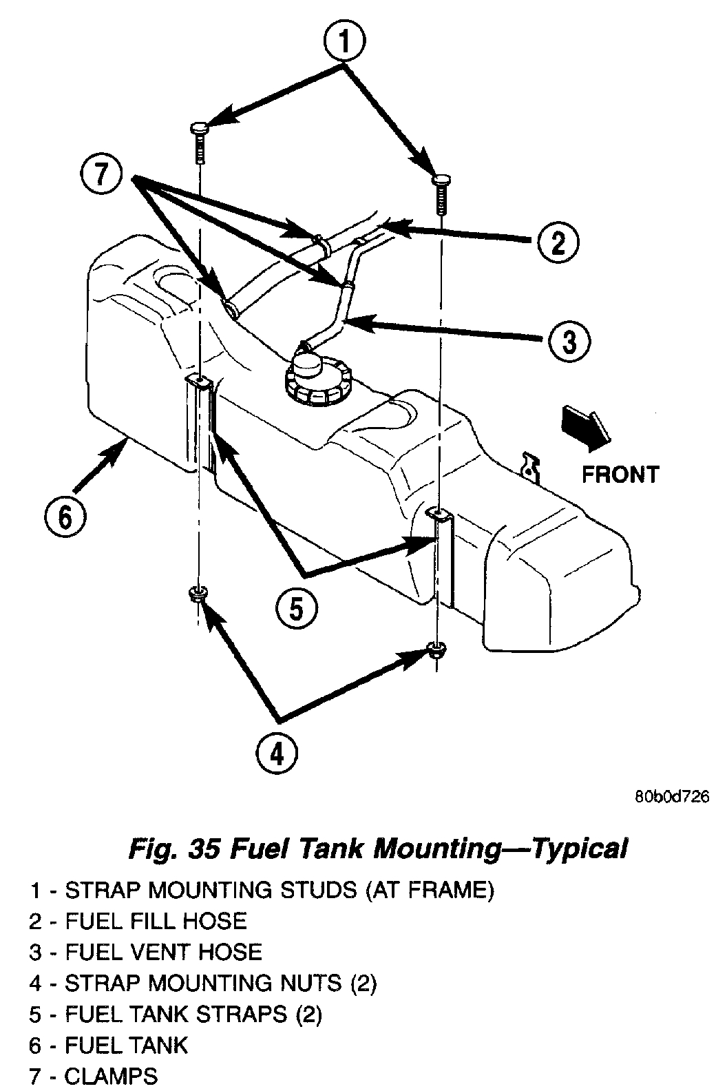 8. Remove fuel tank mounting strap nuts from mounting strap studs (Fig. 35). If equipped, remove fuel tank shield bolts.