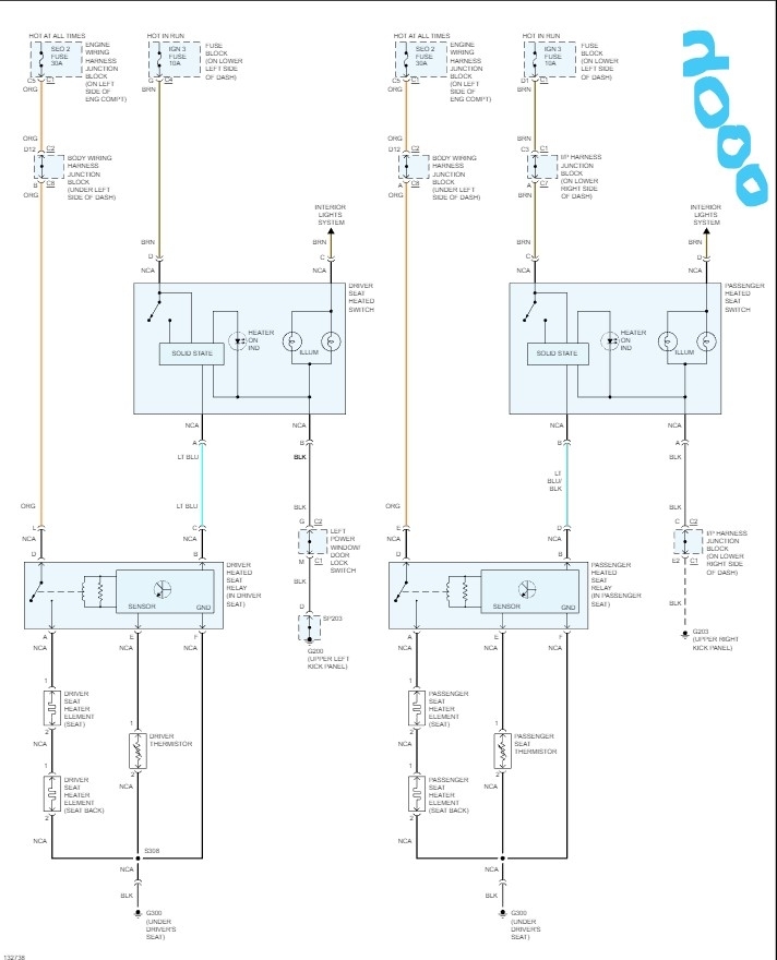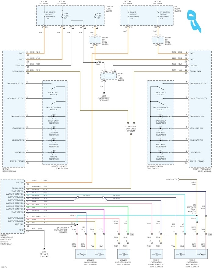 We’re trying to retrofit a 2004 Tahoe power passenger seat into the truck listed above. Bolts up fine as we were advised it would, but the wiring harnesses aren’t matching up. There doesn’t appear to be a memory seat for the passenger side on the vehicle harness side which is fine - but the connections for the seat heat are also different. The passenger side connector on the 2000 is a 6-pin connector with 4 wires actually in use (2 brown for hot, black and light blue for power to the heat relay and the switch connection, it appears). On the donor seat from the 2004 Tahoe, it’s a 16 pin connector with orange for hots, but can’t figure out which wires to leverage for the switch as there are multiple choices and the schematic, I’ve found doesn’t match color-wise. Photos below are of the 2004 Tahoe connector.